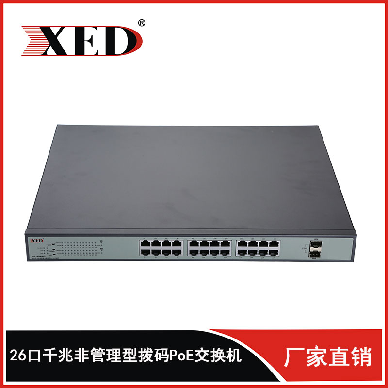 24個10/100M RJ45電口,2個1000M上聯(lián)口和2個千兆SFP光纖模塊插槽;26口千兆非管理型交換...